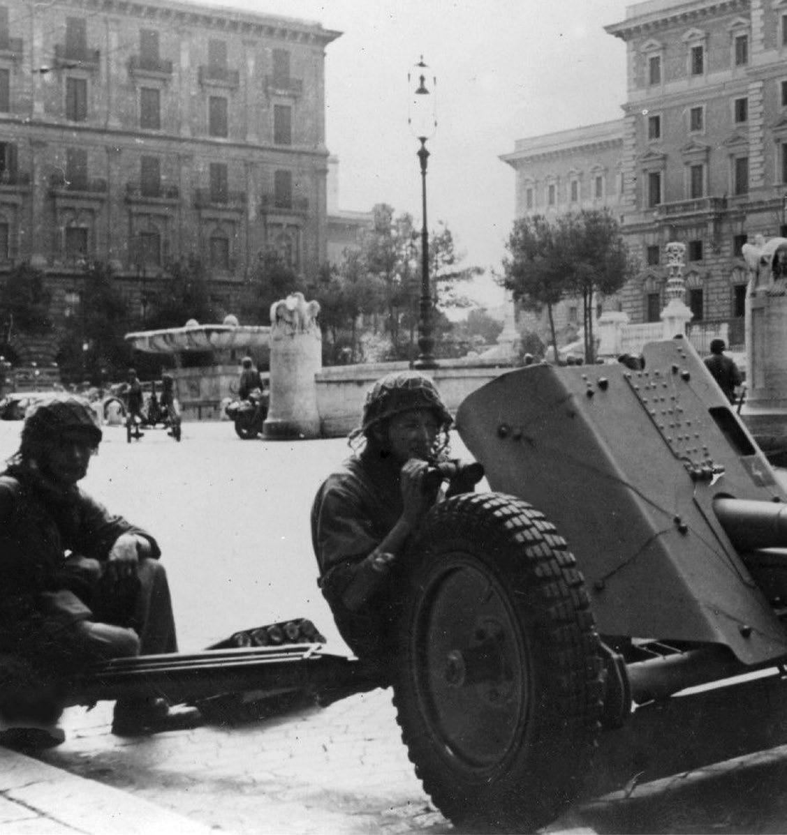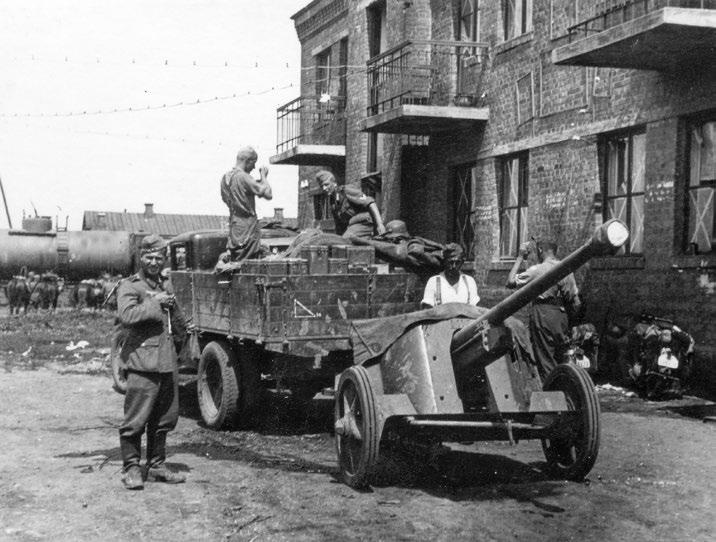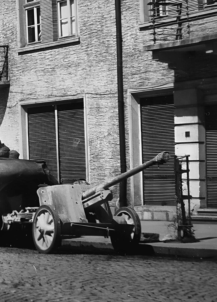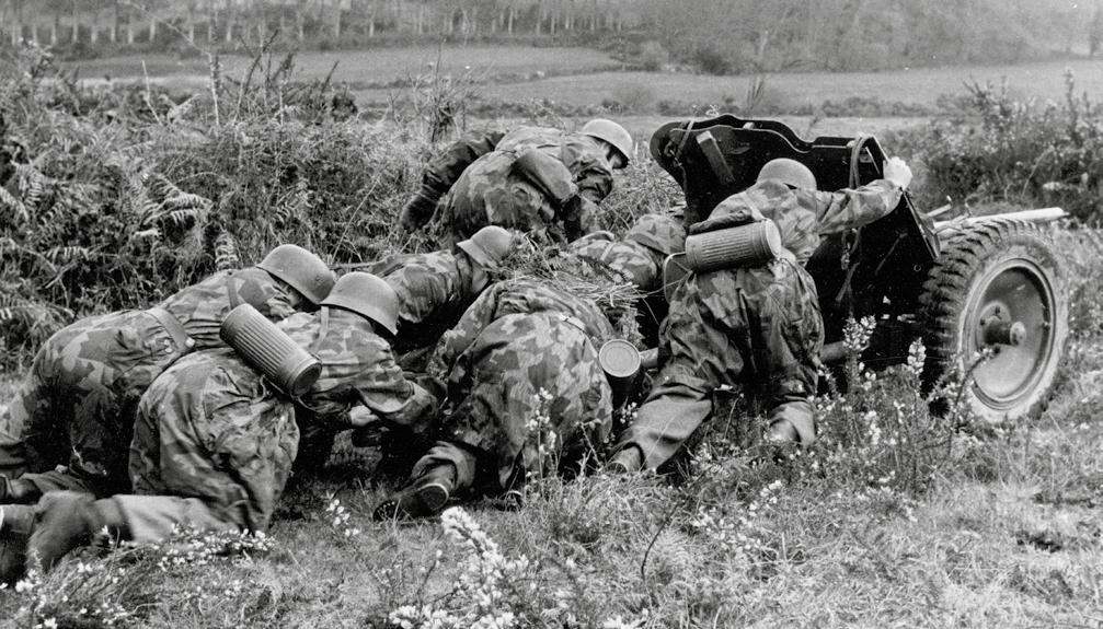 Oddíl Fallschirmjäger (výsadkářů) přesunuje protitankový kanón PaK 41 ráže 4,2 cm do skrytého palebného postavení. Hlaveň děla byla zkonstruována na principu Gerlichova kuželovitého vývrtu a střílela municí s tvrdým jádrem, která dokázala na vzdálenost 100 m prorazit pancíř o síle 100 mm.