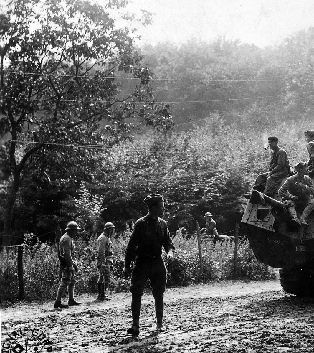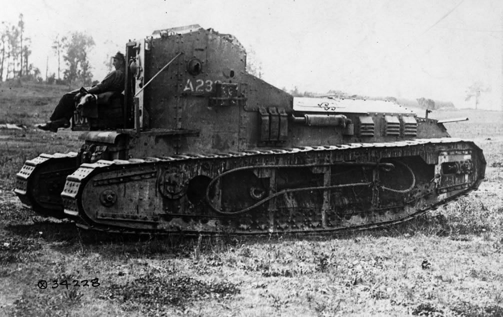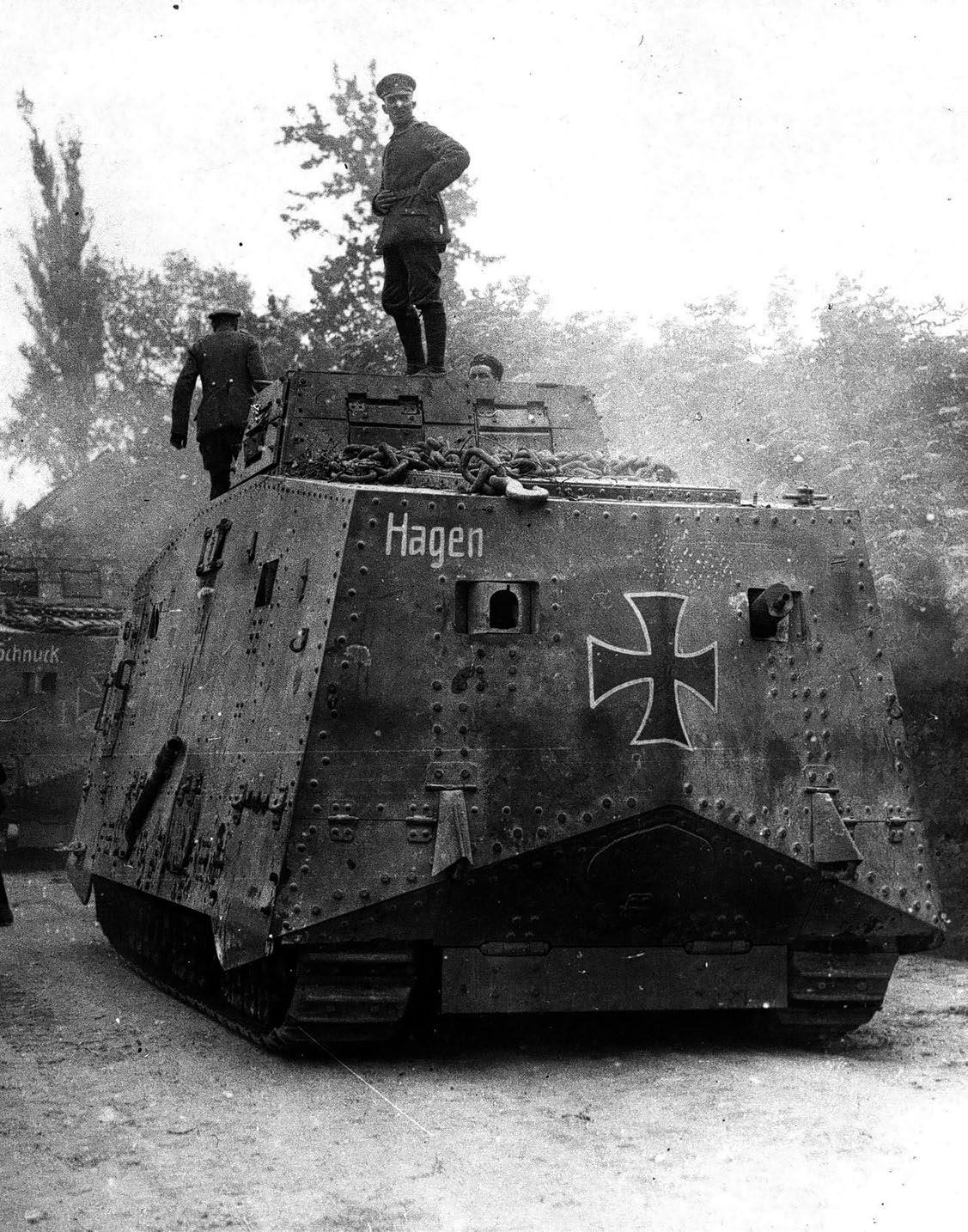 Na protější straně: Německá říše se opozdila s vývojem tanku, což mělo za následek, že do konce první světové války bylo postaveno pouhých asi 20 kusů tanku A7V. Nicméně z fronty bylo převezeno velké množství Beutepanzer (ukořistěných tanků) –převážně britských, a když to bylo možné, byly opraveny a využity německými silami. (NARA)