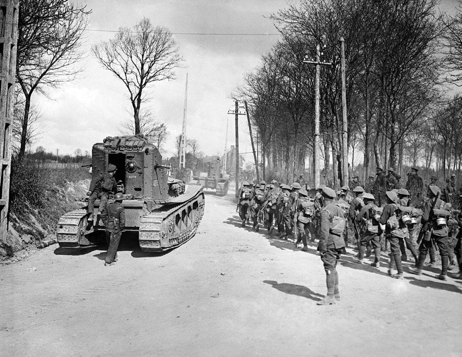 Kolona středních tanků Mark A Whippet z 3. tankové brigády 3. praporu (lehkého) tankového sboru míjí muže novozélandské pěší divize u Mailly-Maillet během německé jarní ofenzivy, která byla zahájena 28. března 1918. (NARA)