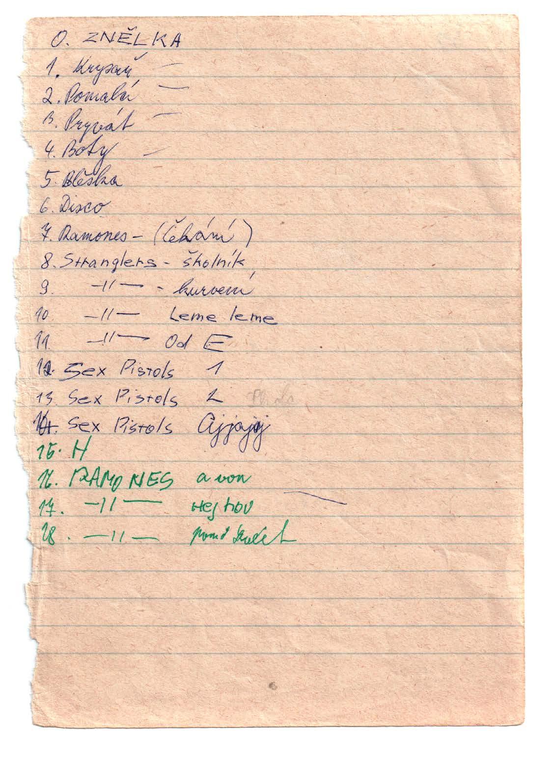 Hudební doprovod vykazoval logické zjednodušující aranžérské odlišnosti i jiné amatérské nedostatky, třeba nutně opakovaný začátek nebo spíše legrační kytarové sólo. V šestnácti sedmnácti se žádné velké umění nekonalo, ani zával energií ne. Petr měl vzpurnou britskou muziku na tři akordy rád, celý život ji hodně poslouchal, ale mám pocit, že punkerem byl spíše zevnitř než na pódiu. Upřímně řečeno, s jeho hlasem by spokojit se s několika málo křičenými tóny vzdoru bylo proti pánubohu. Mukův rukopisný archiv skrývá rozličné klenoty a repertoárový list Duralu k nim rozhodně patří. Znělka a dalších osmnáct položek jsou rozděleny do čtyř bloků. Vlastní tvorba obsahuje třeba v roce 2000 znovu naleštěné Boty, ale najdete tam také Krysaře, Pryvát (!), Disco nebo Blešku. Ramones jsou bez původních názvů a připsané poznámky typu „Hej hou“ nebo „Čekání“ k identifikaci předloh nepostačují. Ani rovněž anonymní čtveřici songů od Sex Pistols nezařadím, neboť přípodotek „Ajajaj“ by mohl dost dobře platit pro cokoli. Úplnou lahůdkou jsou pak Stranglers: faktická muzikantská poznámka „od E“ je jasná, ale co hledat pod označením „Kurvení“ napíná moji fantazii na maximum.