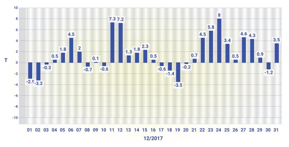 Obrázek 2.3 Změny teploty vzduchu T (°C) – Brno, prosinec 2017.