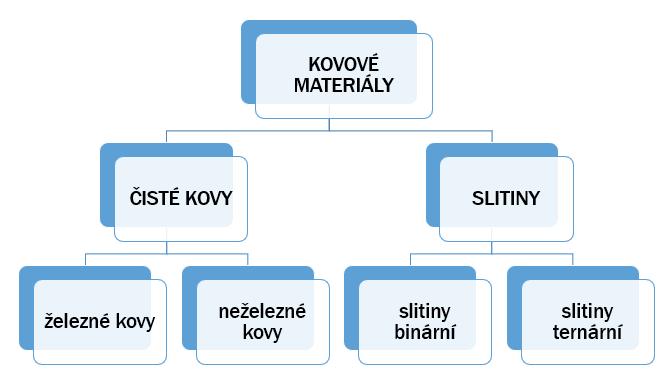 Obrázek 2.4 Základní rozdělení kovových materiálů na kovy a slitiny.