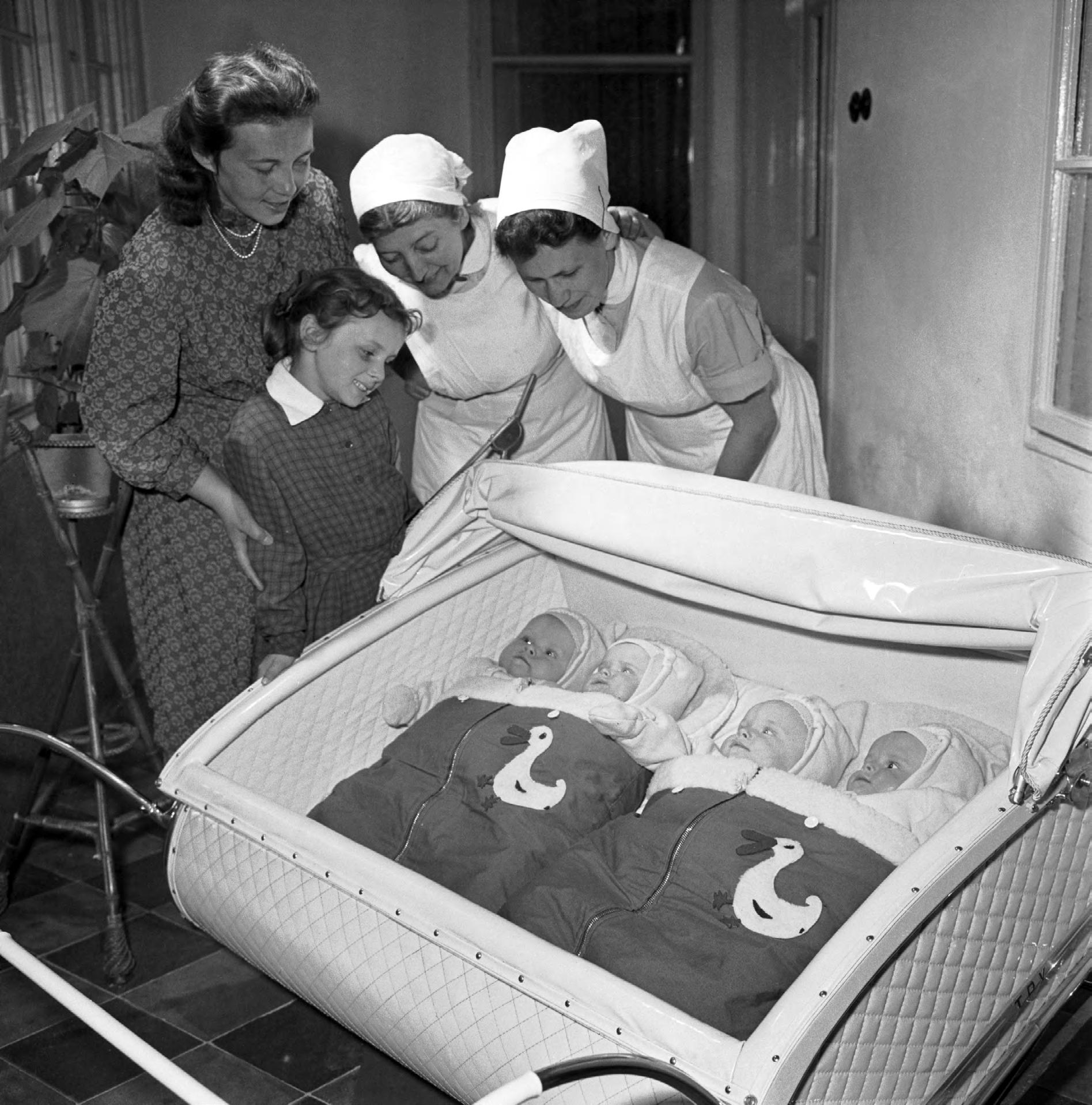 Zbraslavická čtyřčata Hourova (zleva) Václav, Miroslava, Ivan a Jana v sedmi měsících, nad nimi matka Marie Hourová, starší sestra Marie Hourová, vrchní sestra dětského oddělení kutnohorské nemocnice Anna Kocyová a ošetřovatelka Marie Padevítová. Foto ČTK / Josef Mucha