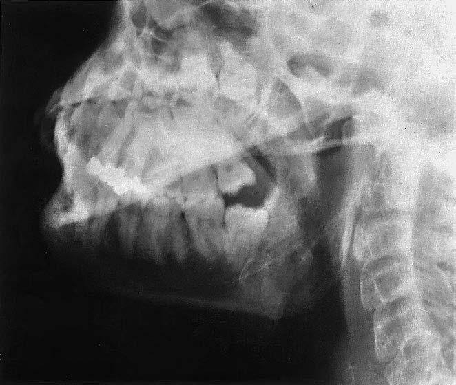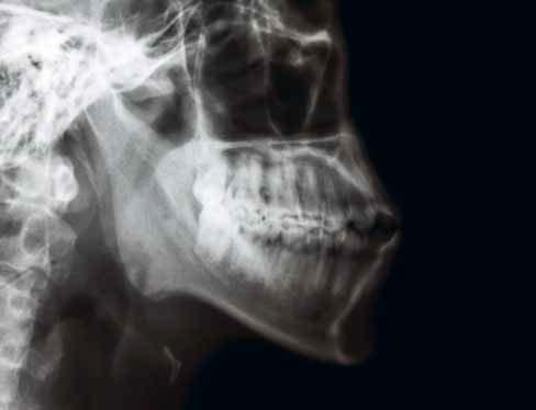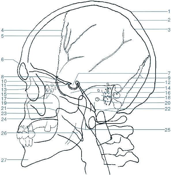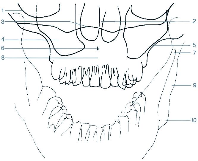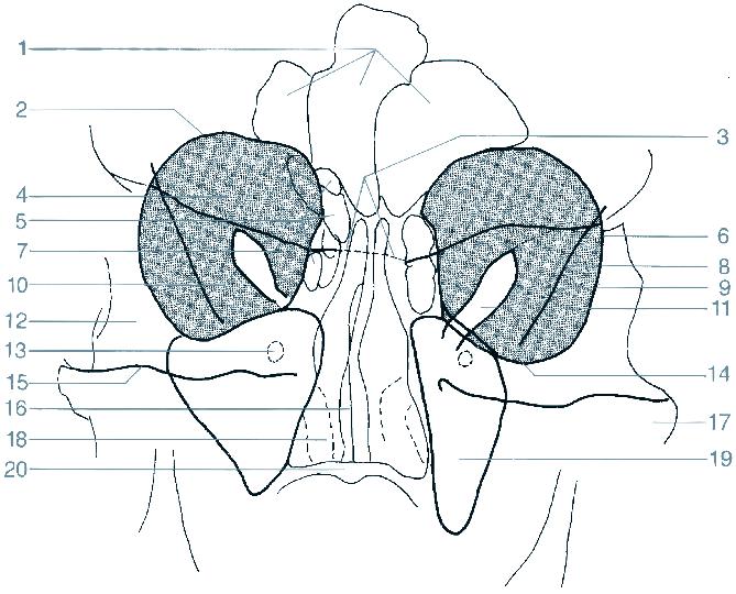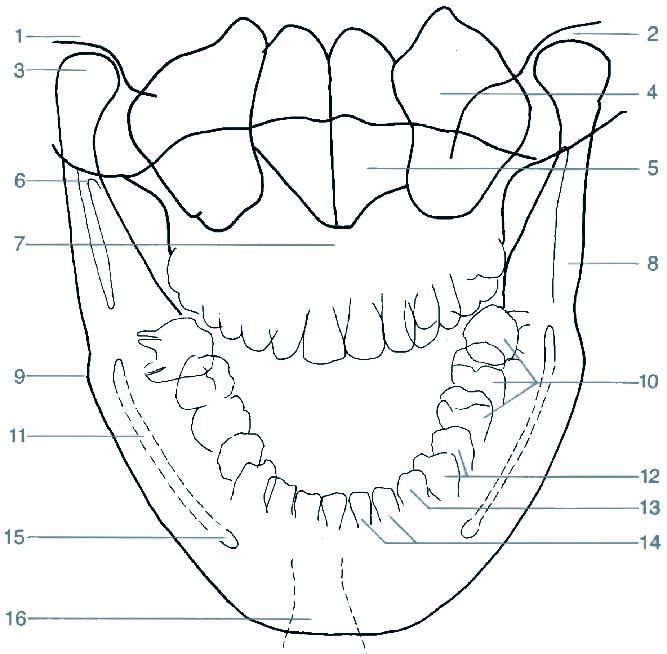 10 recessus alveolaris (dno dutiny horní čelisti) 11 sinus maxillaris (dutina horní čelisti) 12 fossa pterygopalatina 13 processus pterygoideus (křídlový výběžek kosti klínové) 14 angulus mandibulae (úhel dolní čelisti) 15 stín jazyka 16 canalis mandibulae (kanál v dolní čelisti) 17 os hyoideum (jazylka) 18 foramen apicis radicis dentis