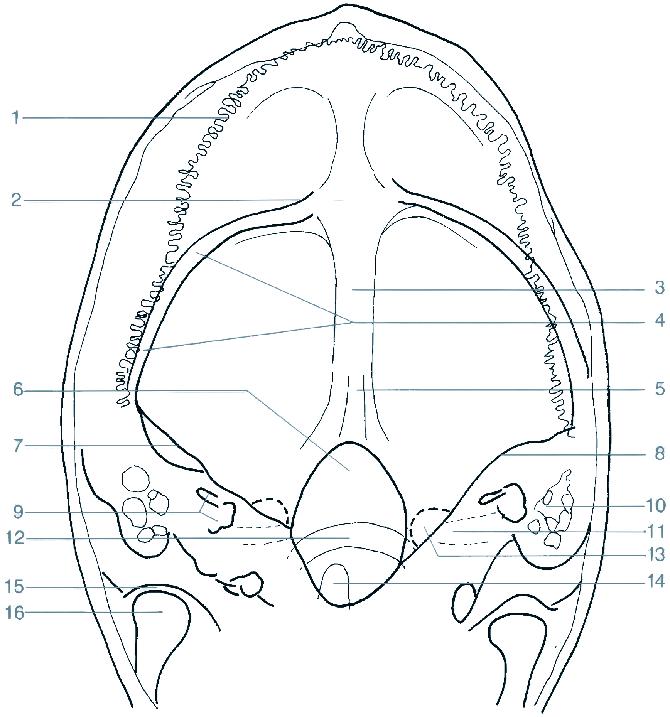 15 horní hrana pyramidy (kosti skalní)