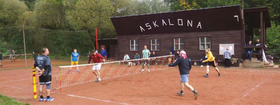 Od Zlaté záře se po hlavní cestě osady blížíme k centru sportu a zábavy osady Askalona. Vlevo za Hadí řekou spatříme původní dvojchatu osady Askalona (1937, bratři Jan a Josef Vrbenských), která se stala dominantní a během 2. světové války propojila všechny čtyři osady do jediné. U chaty bylo od počátku volejbalové hřiště, zaniklo po vybudování obou nových hřišť. O něco výše stojí chata Josefa Samuela (1938). To už po cestě přicházíme ke dvojici hřišť s osadní chatou. Ta byla s prvním hřištěm vystavěna roku 1967, druhé hřiště přibylo o dva roky později. Protože stojí v těsné blízkosti říčky, dochází k častým poškozením povodněmi.