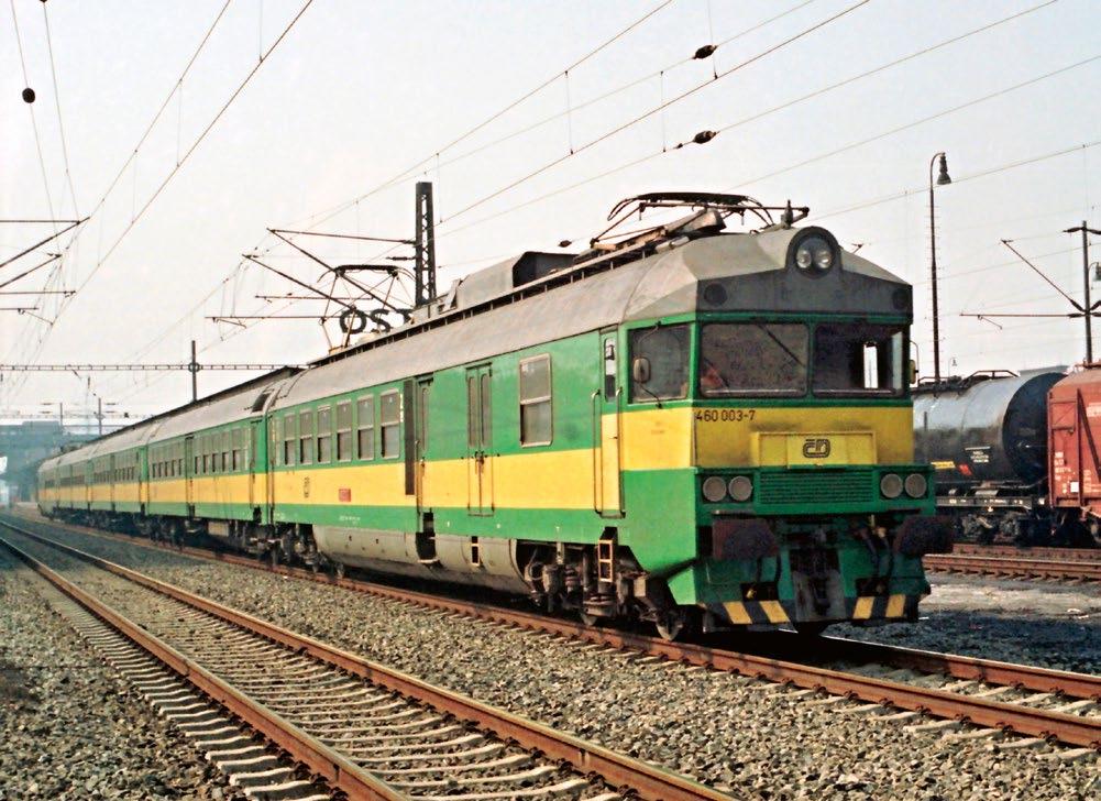Prototypová jednotka v obnoveném atraktivním červeno-krémovém nátěru v čele s vozem 460.001-1 čeká dne 8. 4. 1993 v ld Bohumín na výjezd z depa. Foto Jiří Adamovský.