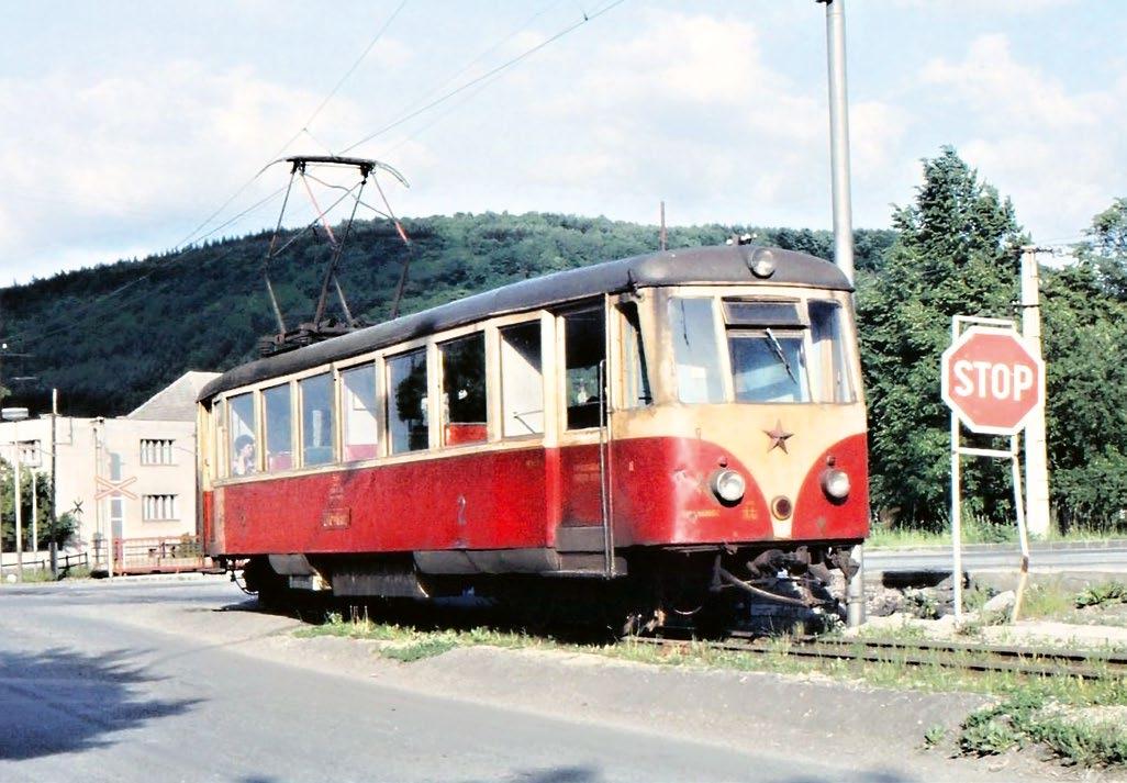 Na krátké místní dráze z Trenčianské Teplé do Trenčianských Teplic byl provoz zahájen v roce 1909. Původní elektrické vozy vystřídaly v roce 1951 nově dodané vozy z Vagónky Tatra Studénka, které zde sloužily až do roku 2011, kdy byl provoz osobních vlaků zastaven. Od té doby je na trati provozována pouze příležitostná doprava. Na fotografii z 5. 6. 1984 je elektrický vůz řady EMU 46.002 na cestě do stanice