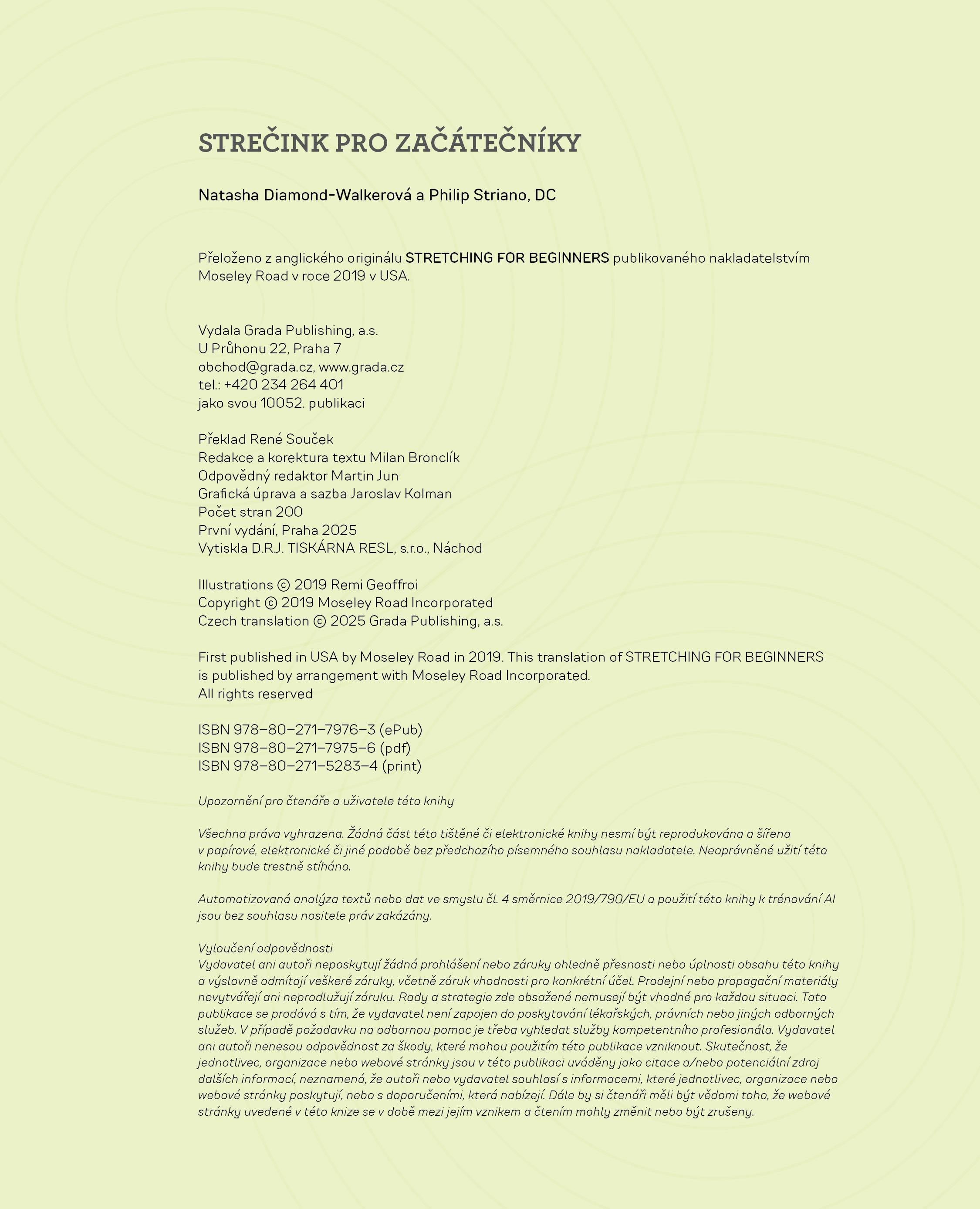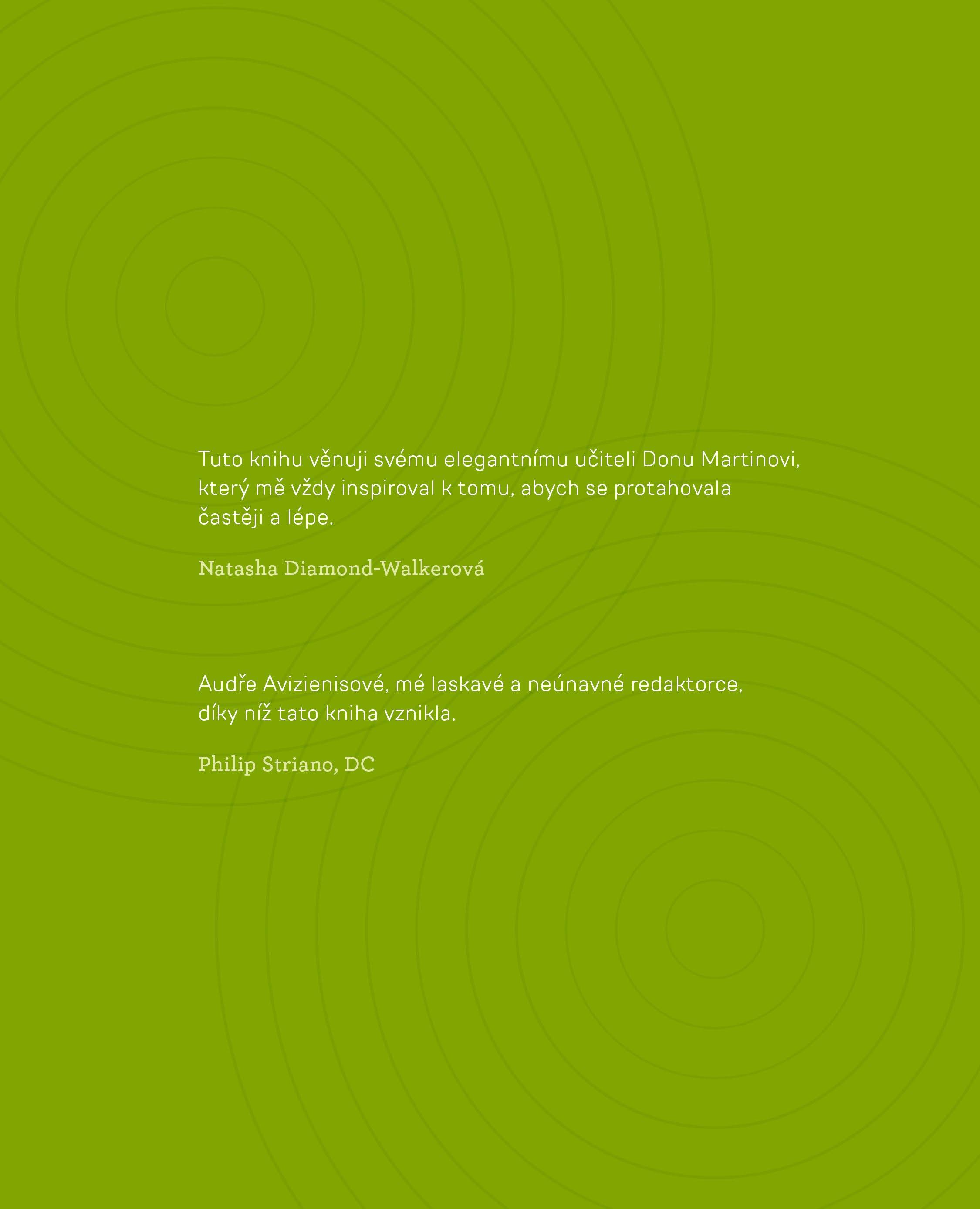 provádění. Popíšeme si správné techniky dýchání a způsoby, jak můžete strečink zařadit do svého každodenního programu. Pokud se do toho chcete vrhnout hned, můžete v první části knihy přejít na kapitolu 3 (strana 17).