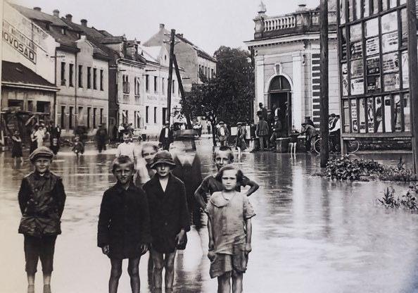 Nádražní ulice při povodni v roce 1926. Vpravo proslulá restaurace Monako. Ulice byla zbourána kvůli stavbě autobusového nádraží.