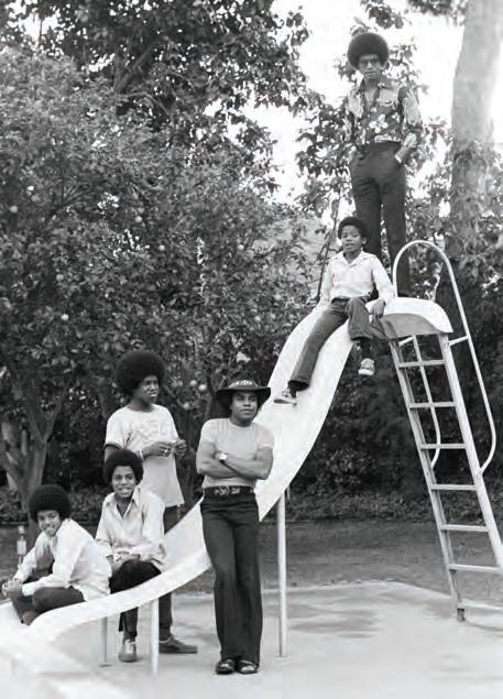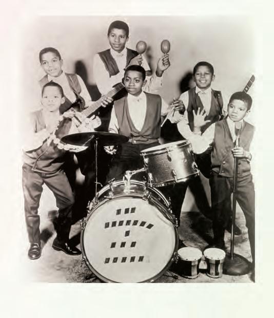Skupina Jackson 5 pózuje na fotografii v původním složení z roku 1966 s Johnnym Jacksonem (není s nimi v příbuzenském vztahu) na bicí. Po směru hodinových ručiček zleva dole: Marlon, Tito, Jackie, Jermaine, Michael a Johnny.