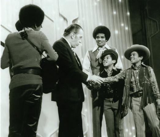 Nahoře: Pořad The Ed Sullivan Show byl v letech 1948–1971 stálicí nedělních večerů na televizní stanici CBS. Sullivan se zde zdraví se skupinou Jackson 5 během jejich vystoupení 14. prosince 1969. Sullivan si potřásá rukou s bratry Michaelem (vpravo) a Marlonem (druhý zprava), zatímco se na ně dívají jejich starší bratři Jackie (třetí zprava), Tito a Jermaine (oba vlevo).