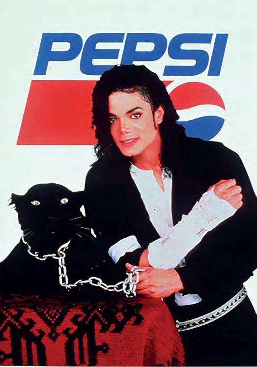 Vlevo: V listopadu 1983, rok po vydání alba Thriller, se Michael stal součástí reklamní smlouvy mezi Pepsi a Jacksonovými, která měla hodnotu 5 milionů dolarů. Není pochyb o tom, že to byl právě Michaelův věhlas, který posunul finanční hranice v reklamách na obchodní značky.