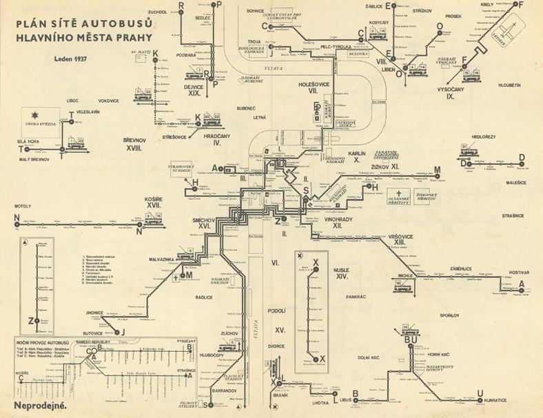 Plán sítě autobusů z roku 1937 dokumentuje tehdejší autobusovou síť doplněnou o jednu trolejbusovou linku K. Vidíme zde, že autobusové linky navazovaly na linky tramvajové a obsluhovaly pražská předměstí