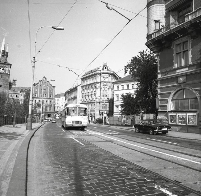 Přes Smetanovo nábřeží byla trasována překryvná autobusová linka již od roku 1964; o pět let později zde byl vyznačen vyhrazený jízdní pruh pro autobusy vedený po tramvajovém pásu. Snímek byl pořízen v druhé polovině 70. let 20. století