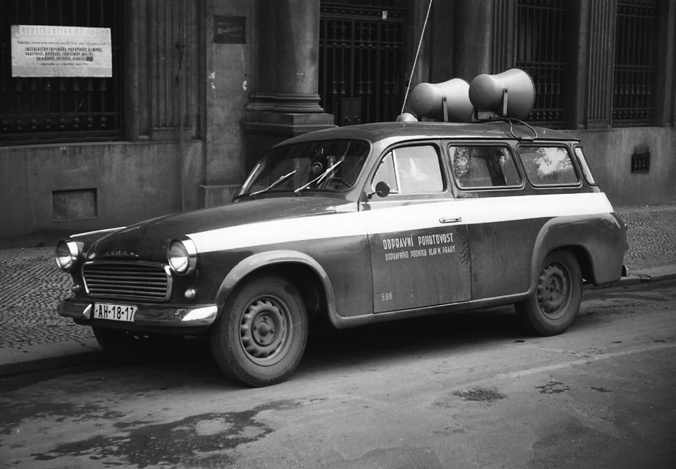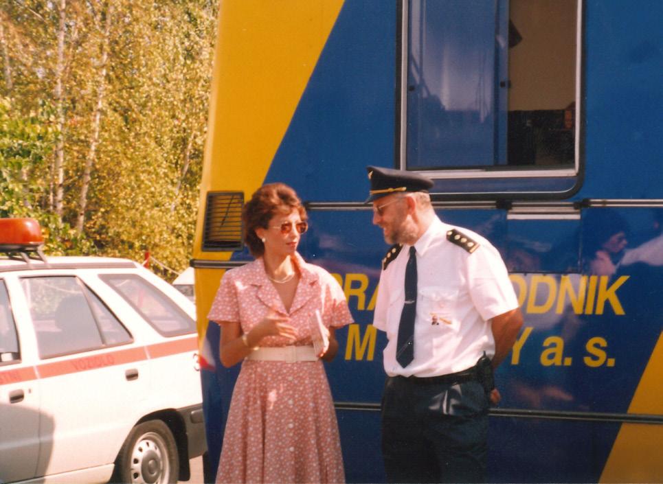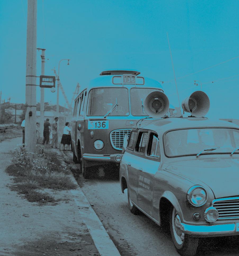 Na snímku z roku 1999 je autor publikace Ing. Bohumír Vojtíšek, tehdy ve funkci vedoucího odboru řízení provozu, zachycen při rozhovoru s tehdejší tiskovou mluvčí DPP Mgr. Zuzanou Knoblochovou před autobusem Karosa upraveným na mobilní dispečerskou ústřednu