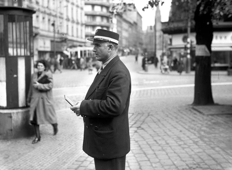 Dozorce provozu vyfotografovaný v roce 1948 na Tylově, tehdy Scheinerově náměstí, určitě nedrží dotykový mobilní telefon! S největší pravděpodobností se jedná o zápisník s časy průjezdů vozidel kontrolním bodem
