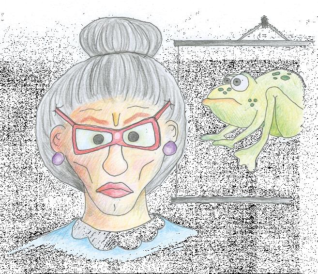 „Otevřete si své učebnice na straně šedesát osm,“ ozvalo se od tabule v malé třídě plné dětí. To paní učitelka upozorňovala na obrázek žáby v učebnici, jejíž velký plakát právě pověsila i na stěnu za svým stolem. Zvedla ještě levý horní roh o pár centimetrů výše, aby plakát visel opravdu rovně, a otočila se zpět k žákům 3.C. Letmým, ale přesto přísným pohledem, pohlédla do lavic, zda již mají všichni své knihy otevřené a dávají pozor. Brýle, které neměla opřené za ušima, ale doslova zapíchnuté do vyčesaného drdolu prošedivělých vlasů, si ukazováčkem přistrčila až k obočí a její oči kmitaly po třídě ve směru od dveří k oknům.