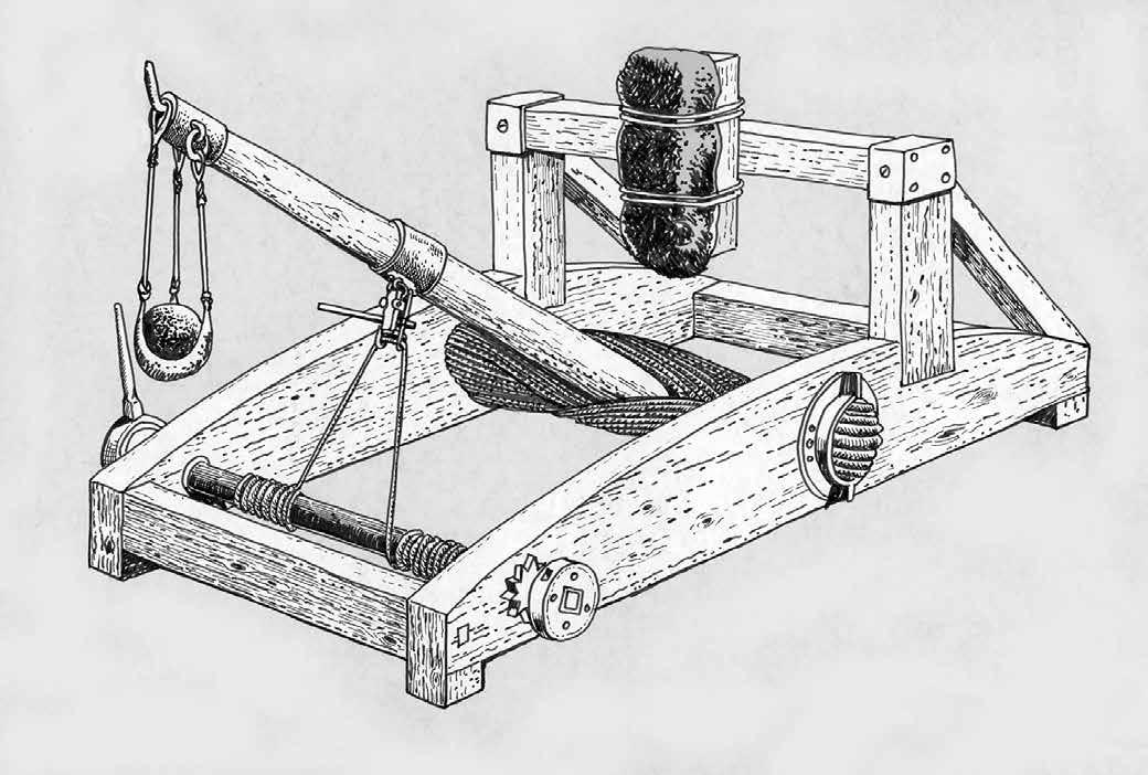 účinkem. Před zavedením palných zbraní bylo navrženo mnoho vrhacích strojů, které se používaly k vrhání různých druhů projektilů (velké šípy, ostré kameny a balvany). Katapult byl starověkou neurobalistickou neboli torzní zbraní. Jeho hnací síla byla zajištěna pružností zkroucených šlach a lan. Skládal se z pevného dřevěného rámu držícího otočné rameno pevně napnuté na rotačním válci vybaveném zkroucenými lany. Trebuchet, zavedený pravděpodobně během křížových výprav, byl další vrhací stroj, který zase využíval energii protiváhy.