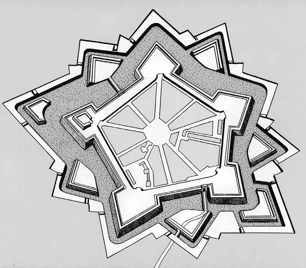 Zavedení nízkoprofilovaného bastionového opevnění na počátku 16. století mělo dvě důležité funkce. Za prvé dobře odolávalo projektilům útočníků, za druhé umožňovalo rozmístění mnoha dobře chráněných obranných děl, jež mohla využívat vzájemné křížové a boční palby.
