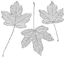 ‘Annae’; středně velký strom, dost hustě větvený, koruna asi tak vysoká jako široká, výška 10–20 m; listy 5–8cm velké, při rašení tmavě červené, později leskle tmavozelené a k okrajům napurpurovělé, 3–5laločné, občas zvlněné, řapíky mléčí