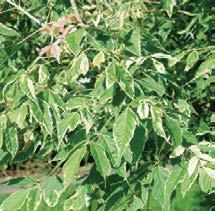 ‘Akikaze nishiki’; dobře větvený velký keř, výška 4–6m nebo někdy více; listy jsou menší než má původní druh, nepravidelně 5–7laločné, bělopestré, občas jsou celé laloky nebo polovina čepele celá bílá