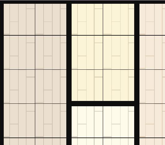 Jižně od: V kterékoliv nižší řadě, nikoliv nezbytně ve stejné místnosti.