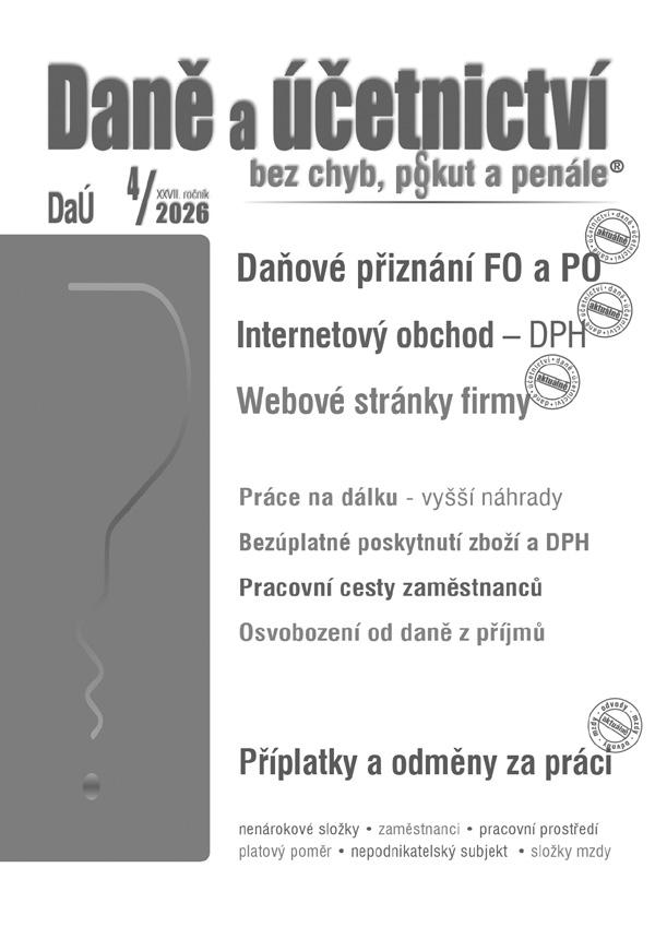 Jaká témata na Vás čekají v našich dalších měsíčnících? V Poradci 7-8/2026 je uveřejněn Daňový řád s komentářem, v DaÚ 4/2026 Daňové přiznání FO a PO a Internetový obchod - DPH, v DÚVaP 3-4/2026 Problémy mzdové účetní a Od účetní závěrky k daňovému přiznání, v 1000 řešení 1-2/2026 Pomocník mzdové účetní k 1. 1. 2026.