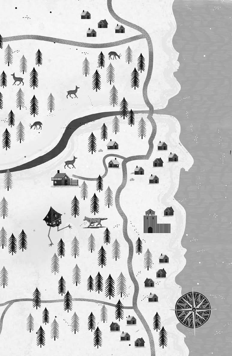 v očích, až mám chuť ho ujistit, že věřím každičkému příběhu, který mi kdy vyprávěl. Ale místo toho vstanu a otevřu podlouhlou dřevěnou truhličku uloženou na krbové římse. Uvnitř je mé oblíbené plnicí pero a moje kopie Anatolijovy mapy. Vlastnoručně jsem si ji nakreslila, když k nám zavítal posledně, a jsem na ni opravdu pyšná, přestože není tak úhledná jako ta jeho. Rozvinu ji na stole a opatrně zakreslím chaloupku na muřích nožkách na její nové místo.