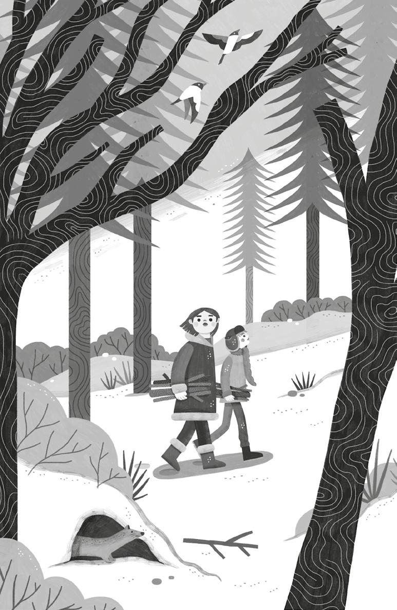 Mamočka nad vzkazem zakroutí hlavou, ale větvičky si od ní vyslouží úsměv. Jednu si vetkne do klopy kabátu. Udělám totéž a společně vyjdeme ven na ostrý ranní vzduch, abychom naložily saně vším potřebným na dnešní slavnost.