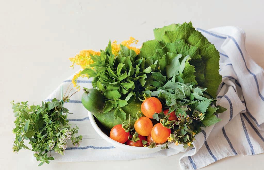 úroda ze zahrádky, kde rostou i divoké rostliny.