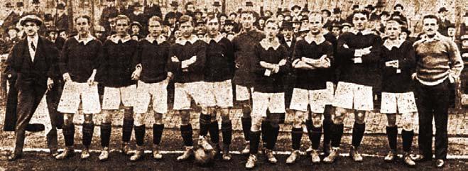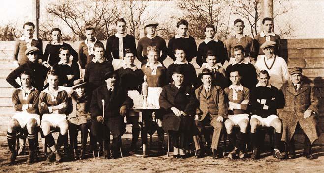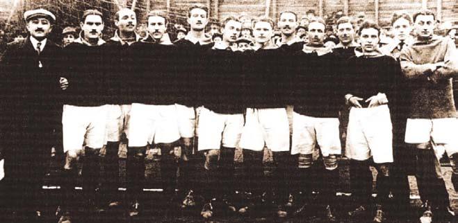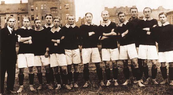 n 1916 – Zleva: ?, Šašek, A. Janda-Očko, Fivébr, Reiszenzahn, Feller, Vaník, F. Janda, K. Koželuh, F. Hojer, Šroubek, Šraml (v civilu) a Burian – před zápasem na Viktorce Žižkov (5 : 2)