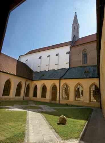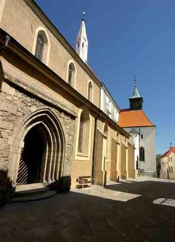 Kostel sv. Jana Křtitele v Jindřichově Hradci – Rajský dvůr se studnou je obklopen křížovou chodbou, kde nechybí rovněž bohatá fresková výzdoba dokonce v několika vrstvách.