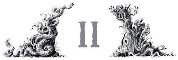 Světlo se zvolna sunulo po podlaze, až se nakonec v nejvzdálenějším koutě dotklo změti podivně zkroucených a propletených ježatých provazů, zakončených uzlovitými hlavami. Provazoví hadi se tam ovíjeli kolem srnčího parůžku s oblýskanou ostrou špicí a výhrůžně plazili roztřepené jazyky.