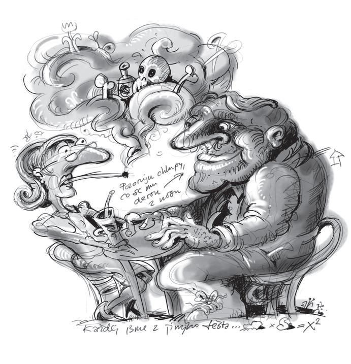 Franta mluví a mluví. Srostlé obočí se pohupuje nad zarudlým nosem. Pichlavé oči se nezastaví. Pozoruji chlupy, co se mu derou z nosu.