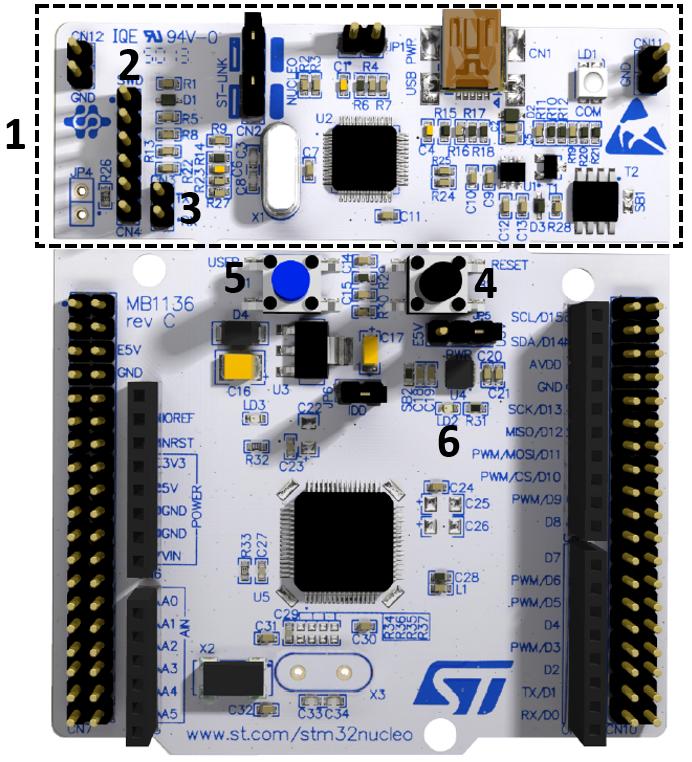 Deskaobsahuje,mimomikrokontroleru STM32L073RZ ,takéjižzmíněnýprogramátoradebuggersloužícíkladěníprogramu (1).Programátorsenacházívhorníčástidesky,kteroujemožnéodspodníodlomit.K programováníkontrolerůmimovývojovoudeskusloužíkonektor CN4 vlevéčásti (2).Horníčásttakéobsahujepřevodníkkomunikacez USB na UART ,jehožvývody CN3 jsouvpravoodprogramovacíhokonektoru (3).Anijedenztěchtokonektorůnenítřebapoužívat,jelikožprogramátoripřevodníkjsouskontrolerem spojenymůstkymezihorníadolníčástídesky.Převodníkjespojensperiferiíkontroleru USART2 ,kterou budemepoužívatvevšechpříkladechkomunikujícíchspočítačem.