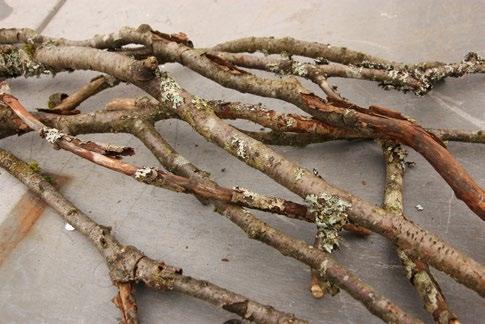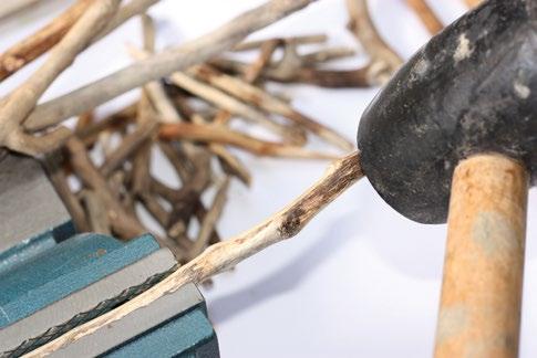 3. Větvičky nalámeme na různě dlouhé kusy (zde 10–15 cm) . Pokud jsou silnější, pomůžeme si gumovou paličkou Postupujeme tak, že jednotlivé větve uchytíme do svěráku a paličkou je ulomíme
