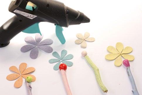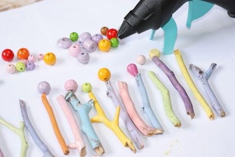 Na konce větviček nalepíme tavicí pistolí větší barevné korálky, které budou tvořit středy kytiček