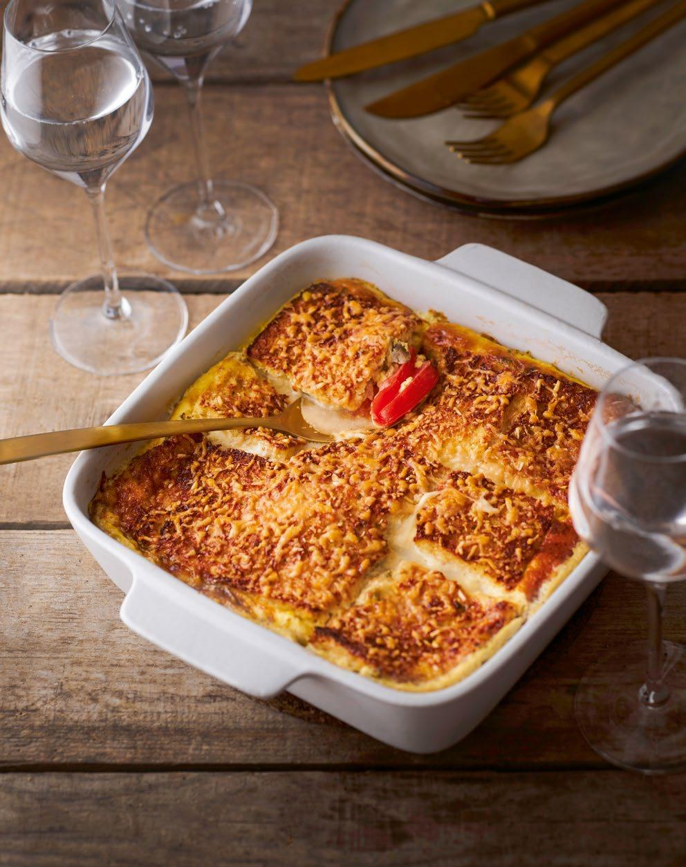 V misce rozšlehejte vejce s mlékem, oreganem, sušeným česnekem, solí a pepřem. Tuto směs nalijte do zapékací mísy a dejte na hodinu odpočinout do ledničky.