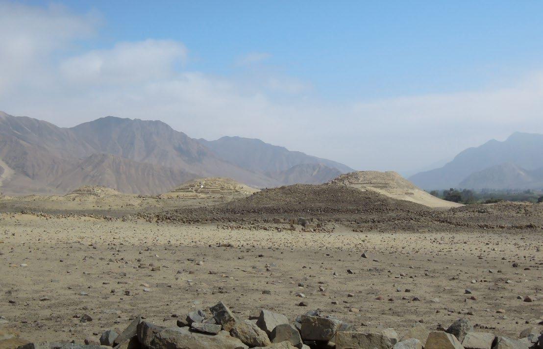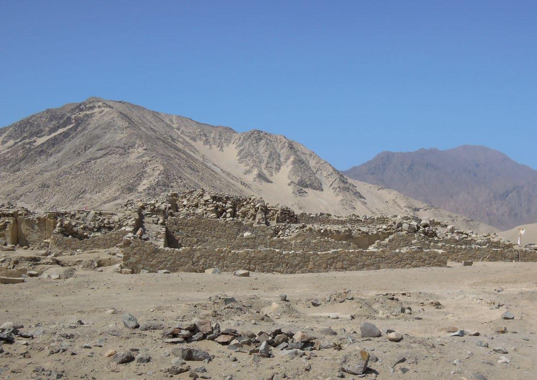 Caral. Zbytky staveb splývají s okolní pouští