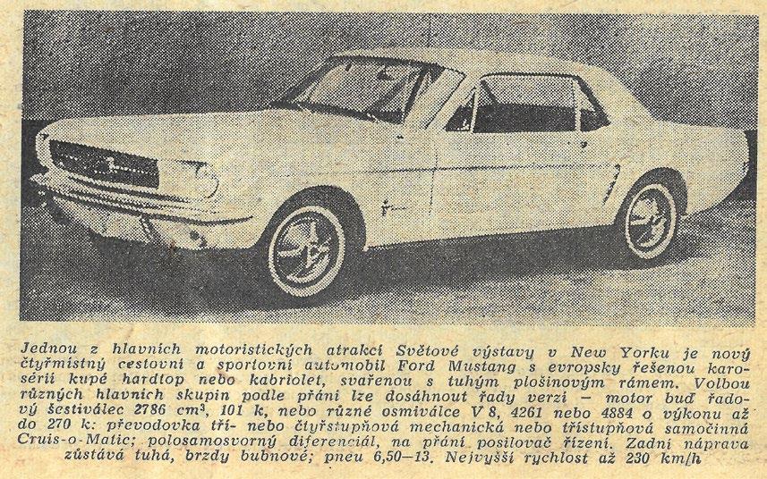 Tehdejším vedoucím redaktorem byla legenda nejenom motoristické publicistiky, ale i našeho motoristického sportu Ing. J. Hausman, a tak nepřekvapí, že Mustanga znovu zmínil v reportáži z pařížského autosalonu v třiadvacátém čísle Světa motorů téhož ročníku. Čtenáři se dozvěděli, že Forda Mustang si během sta dnů od jeho představení koupilo devadesát tisíc zákazníků, na výběr je ze tří verzí karoserie – hardtop, kabriolet a fastback 2+2 („s větráním odsáváním vzduchu“) – a čtyř druhů motorů („6válec 120 k a 8 V o výkonu 200, 225 a 271 k s automatickým nebo 4stupňovým ručním řazením“). Čtenáři u nás v té době vlastně jediného běžně dostupného motoristického čtrnáctideníku se ještě dozvěděli, že Mustang ,,má samosvorný diferenciál Equalbloc, galvanizované hlavní díly karoserie, samočinně se seřizující brzdy, mazání podvozku po 50 000 km, výměnu oleje (plnoprůtokový čistič) po 10 000 km“.