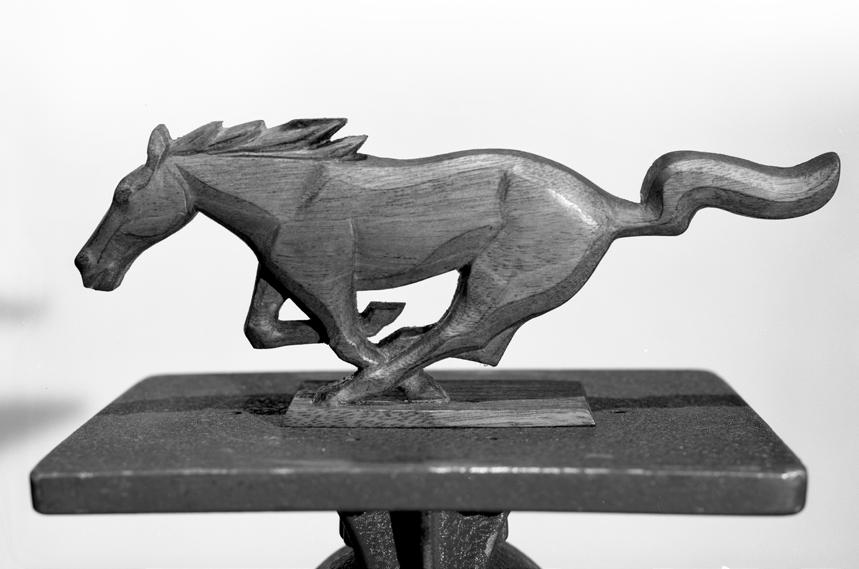 Mahagonový model reliéfu běžícího mustanga vytvořil