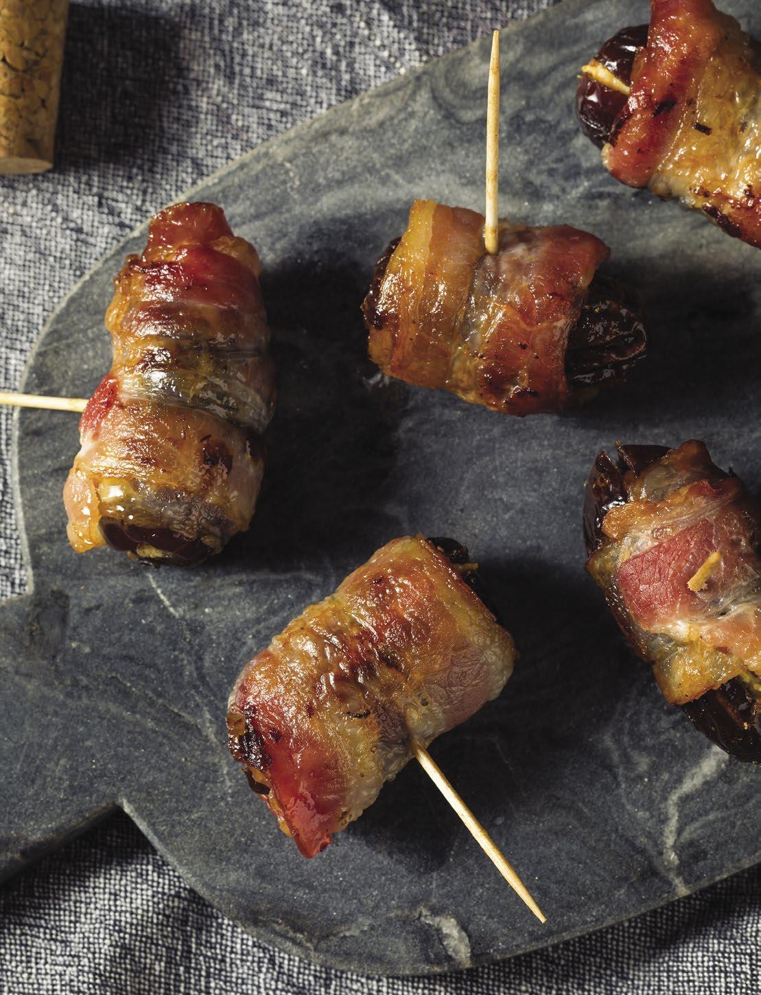 2 . Naplňte každou datli malým množstvím plísňového sýra (pokud ho používáte) a zabalte ji do půlky plátku slaniny.