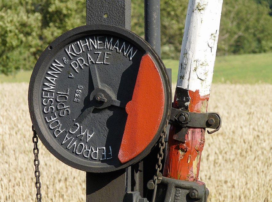 Řada mizejících prvků romantické železniční slávy je hrdě podepsána jejich dávno zmizelými výrobci. Zde třeba mechanismus šraněk zhotovených radotínskou továrnou na železniční potřeby a vozidla Ferrovia, Roessemann & Kühnemann akc. spol. v Praze. Železniční přejezd na trati 086 u Velkého Valtinova, 21. července 2015.