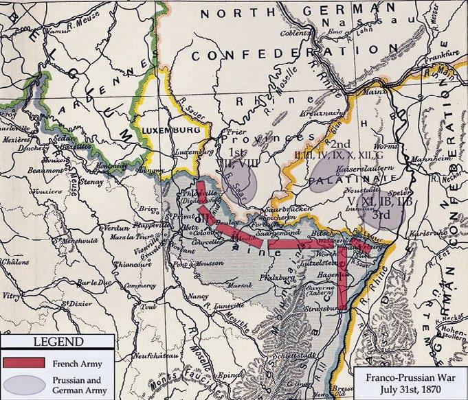 Mapa pozic německých a francouzských armád poblíž hranice 31. července 1870 – zdroj: Cambridge Modern History Atlas – edited by A. W. Ward, G. W. Prothero and Stanley Leathes