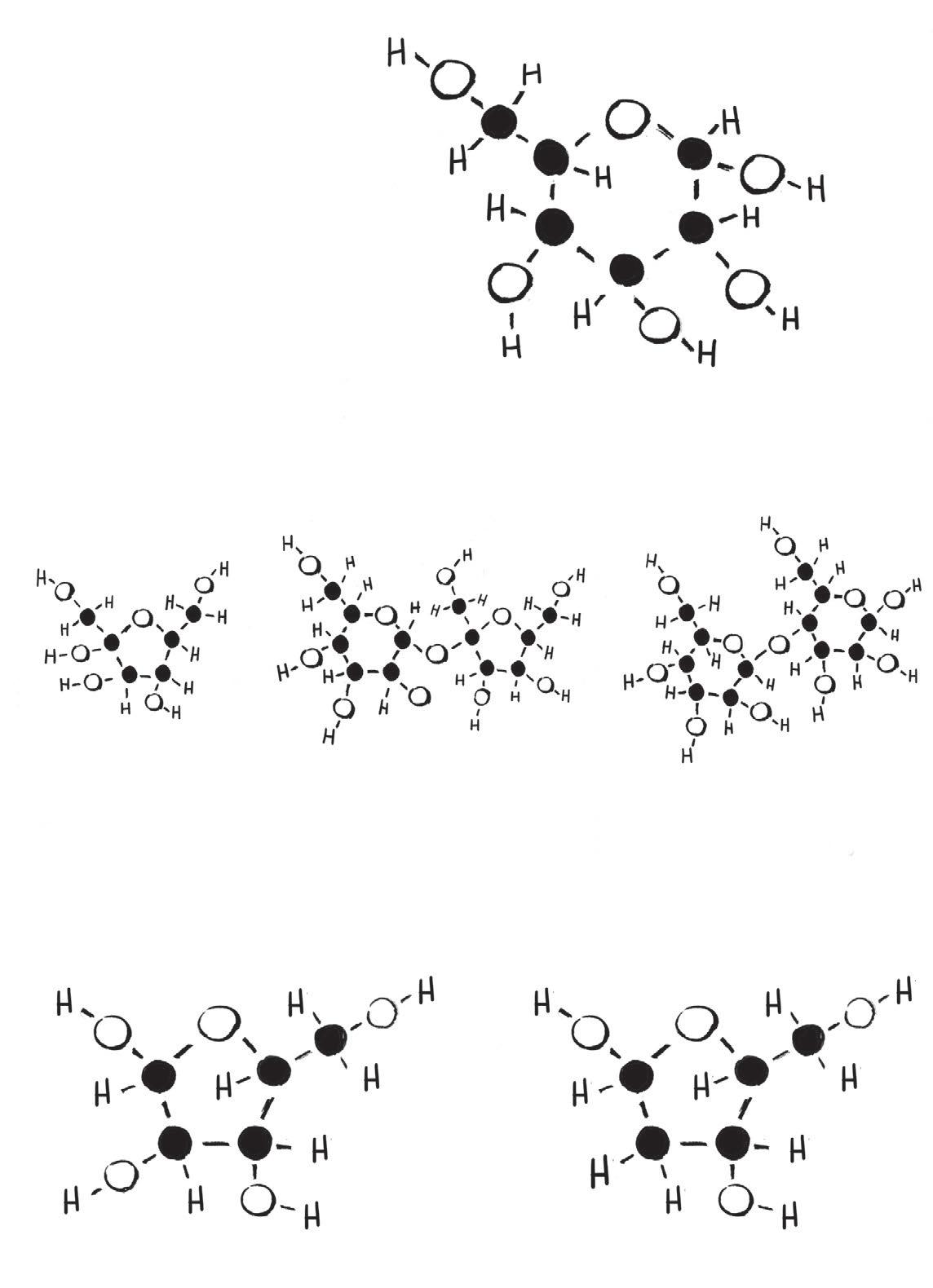 Tyto kruhovité molekuly mají dvakrát víc vodíku než kyslíku. Cukr zvaný glukóza je palivem života: skoro všechny živé organismy spalují glukózu coby zdroj energie.