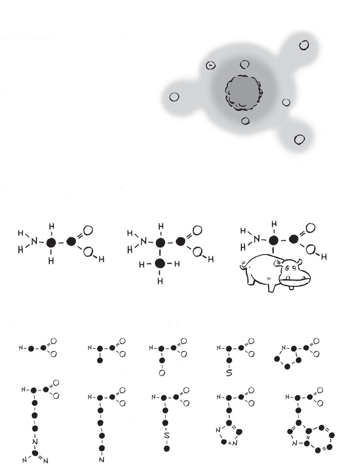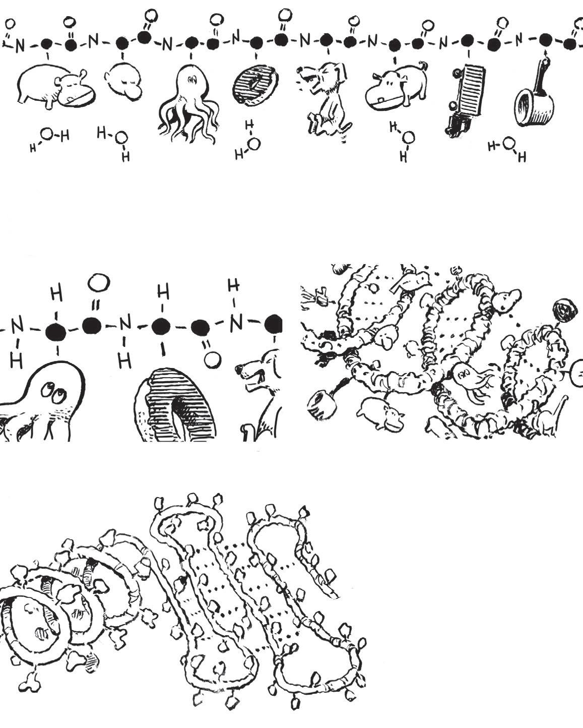 Zjediného řetězce polypeptidu mohou vyrůst stovky, dokonce tisíce aminokyselin, jako absurdně dlouhé náhrdelníky vyrobené z20 různých přívěsků. Vchemii se těmto přívěskům říká zbytky. Ve schématu vynecháváme vodík.