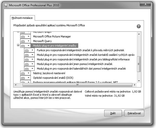 Akce je potřeba doinstalovat do sady Office. Při instalaci sady Office je potřeba označit Nástroje sady Office Moduly plug-in pro inteligentní značky. V nabídce je k dispozici pět plug-inů (obrázek 1.25):