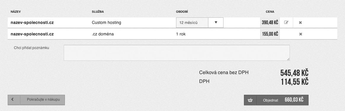 Na obrázku 1.2 máte možnost vidět nastavení custom webhostingu podle parametrů na předchozí straně (konkrétně u společnosti Websupport). Cena za uvedené služby by tedy byla 660,- Kč/rok včetně DPH (viz obrázek 1.3).