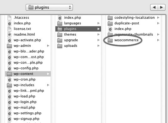 Druhý způsob instalace předpokládá manuální stažení pluginu WooCommerce do vašeho počítače a jeho následné nakopírování na váš FTP server do složky plugins, přesně podle obrázku 2.2. Plugin WooCommerce si můžete stáhnout například na na těchto adresách: http://wordpress.org/plugins/woocommerce/ http://www.woothemes.com/woocommerce/